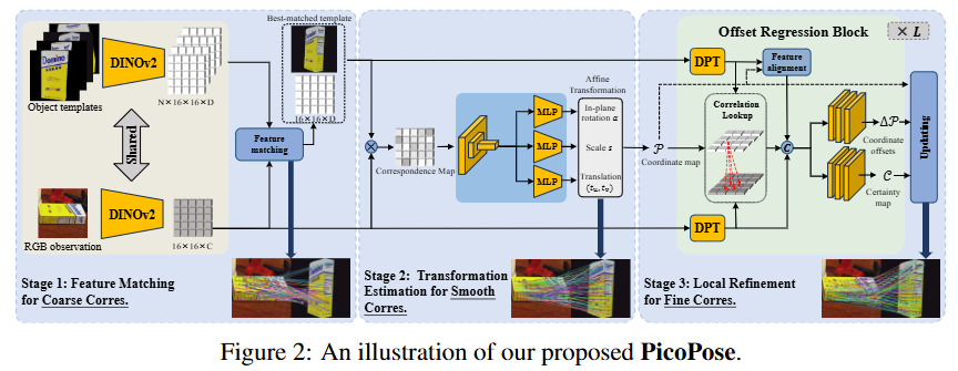 해당 방법론은 DINOv2 feature로 대응점을 구한 뒤 바로 이후의 작업을 수행하는 것이 아니라, feature 사이의 similarity를 구한 map을 이용하여 CNN과 MLP 입력으로 사용하여 2D affine transformation을 예측한 뒤, 여러 Offset Regression Block을 통해 저해상도의 대응점 정보를 보정에 활용하여 점차 고해상도의 대응점 정보를 찾는 방식으로 6D Pose Estimation을 하는 것으로 이해하였습니다.