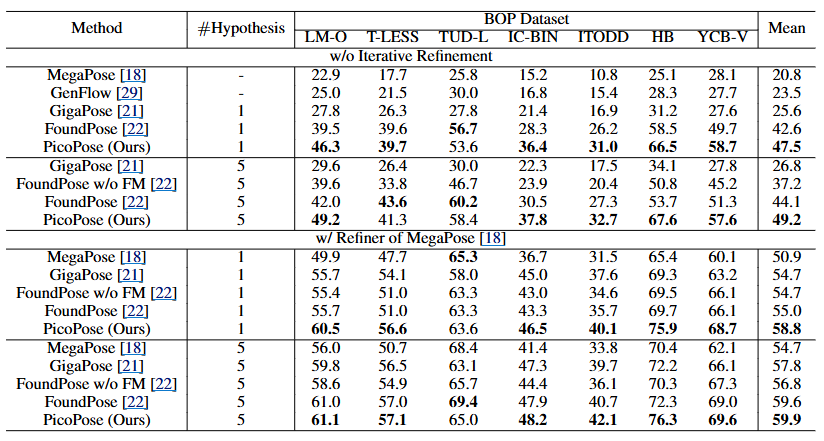 본격적인 성능 비교를 위해 PicoPose를 GigaPose, FoundPose 등 기존의 SOTA 모델들과 비교한 결과는 위 표에서 자세히 확인할 수 있습니다. 이 표를 보면 ‘#Hypothesis’라는 항목이 있는데, 이는 모델이 최종 자세를 결정하기 전에 생성하는 자세 후보의 수를 의미합니다. 가설이 1개인 경우는 가장 가능성이 높은 단 하나의 자세를 추정하는 것이고, 5개인 경우는 5개의 유력한 자세 후보를 생성한 뒤 그중에서 최적의 자세를 선택하여 강인함을 높이는 방식입니다.