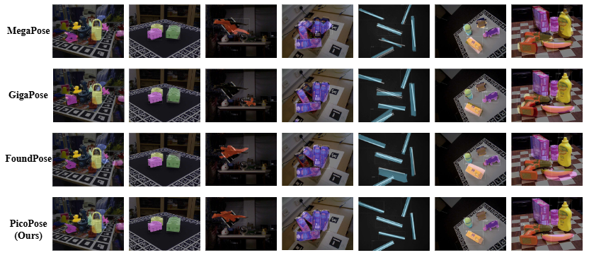 PicoPose는 가설을 1개만 사용한 경우와 5개를 사용한 경우 모두에서 다른 모델들을 큰 차이로 능가하는 SOTA 성능을 달성했습니다. 예를 들어, 5개의 가설을 사용했을 때 후처리가 없는 PicoPose는 GigaPose보다 22.4%, FoundPose보다는 5.1% 높은 AR 점수를 기록했습니다. 이러한 정량적 결과는 아래 fig에서 시각적으로도 뒷받침되는데, 다른 모델들에 비해 PicoPose가 훨씬 정확하게 자세를 추정하는 것을 확인할 수 있습니다.