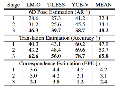 다음으로 저자들은 제안한 방법론의 각 구성 요소가 실제로 효과적인지를 검증하기 위해 Ablation Study를 수행했습니다. 이 표는 Stage 1에서 Stage 3으로 진행될수록 6D 성능(AR)과 이동(Translation) 정확도가 일관되게 향상되는 것을 명확하게 보여줍니다. 또한, 대응점 품질을 나타내는 EPE (End-Point-Error, 픽셀 단위 오차)는 수치가 낮을수록 좋은데, 이 역시 단계가 진행될수록 꾸준히 감소하는 것을 볼 수 있습니다. 이는 PicoPose의 핵심 주장인 점진적 정제의 효과를 강력하게 입증합니다.