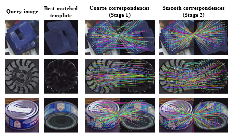 1단계 (Coarse Correspondence): 먼저 관측된 이미지와 렌더링된 3D 모델 템플릿 간의 특징점을 매칭하여 대략적인 대응점을 찾습니다.