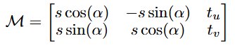 1단계에서 얻은 대응점은 노이즈가 많기 때문에, 2단계에서는 이를 매끄럽게 다듬는 것을 목표로 합니다. PicoPose는 두 이미지 간의 2D 어파인 변환(Affine Transformation)을 예측하여 이 문제를 해결합니다. 이 변환 행렬 \mathcal{M}은 수식 (2) 와 같이 스케일(s), 평면상 회전(\alpha), 그리고 2D 이동(t_u, t_v) 파라미터로 구성됩니다.