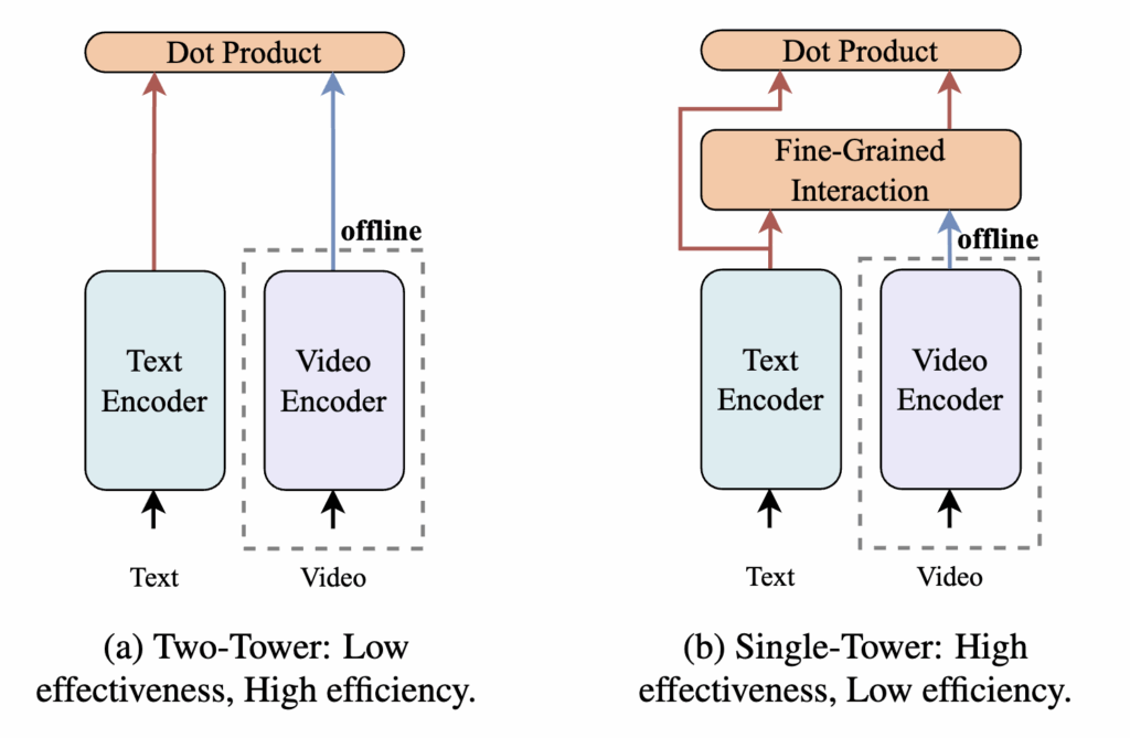 최근 CLIP 기반 연구들은 주로 위 그림처럼 Two-Tower와 Single-Tower 두 가지 프레임워크로 연구가 진행되어왔습니다. Two-Tower 방식은 텍스트와 비디오를 독립적으로 인코딩한 후 단순한 dot product로 유사도를 계산하기 때문에 계산이 빠르고 비디오의 피처를 미리 뽑아 놓을 수 있어 효율성이 높다는 장점이 있습니다. 하지만 세밀한 상호작용이 부족해 정확도가 낮은 한계가 있습니다. 반면 Single-Tower 방식은 텍스트와 비디오 간의 fine-grained interaction 모듈을 통해 더 정교한 매칭을 수행하여 정확도는 높지만, 텍스트 쿼리가 주어져야만 interaction이 가능해 미리 비디오 피처를 뽑아 놓을 수 없어 연산 비용이 크고 효율성이 떨어지는 한계가 있습니다.