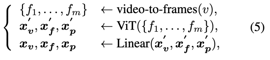 먼저, m개의 프레임 {f1,…,fm}으로 구성된 비디오 v가 주어지면, 이를 비디오 인코더 ϕv(⋅)에 입력하여 visual feature를 추출합니다. 저자가 backbone으로 사용하는 CLIP-ViP는 video proxy tokens를 사용해 video-level [CLS] 역할을 하는 토큰을 생성하고 이를 xv로 표현할 수 있습니다. 여기에 저자는 추가로 ViT layer에서 얻은 frame-level [CLS] 토큰(xf)과 patch-level token(xp)도 추출하면 아래 수식과 같이 표현할 수 있습니다.