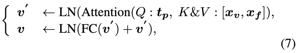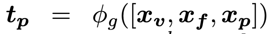 먼저, 이전 단계에서 얻은 video-level 피처 xv , frame-level 피처 xf , patch-level 피처 xp를 모두 concat하여 생성 모듈 ϕg 에 입력하면 pseudo-text query tp를 얻습니다. 이를 수식으로 나타내면 다음과 같습니다.
