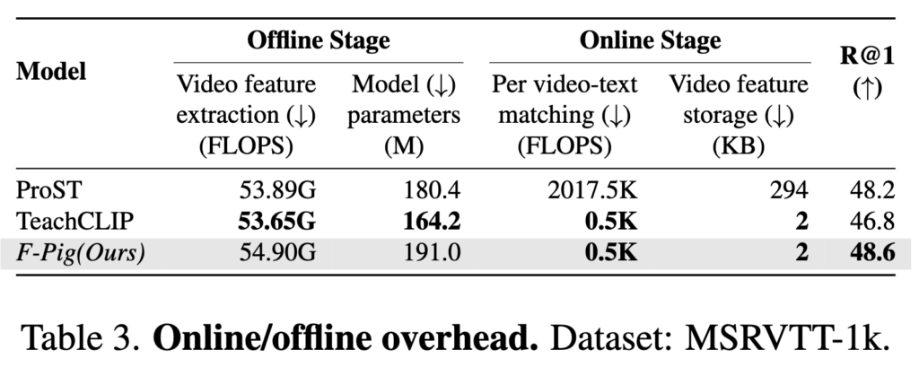 이 표에서는 ProST, TeachCLIP, 본 논문에서 제안하는 F-Pig의 efficiency과 effectiveness 을 비교한 결과입니다. 여기서 Offline Stage는 검색 쿼리가 들어오기 전에 미리 수행되는 작업에 대한 지표이고, Online Stage는 검색 쿼리를 입력했을 때 수행되는 작업에 대한 지표입니다.