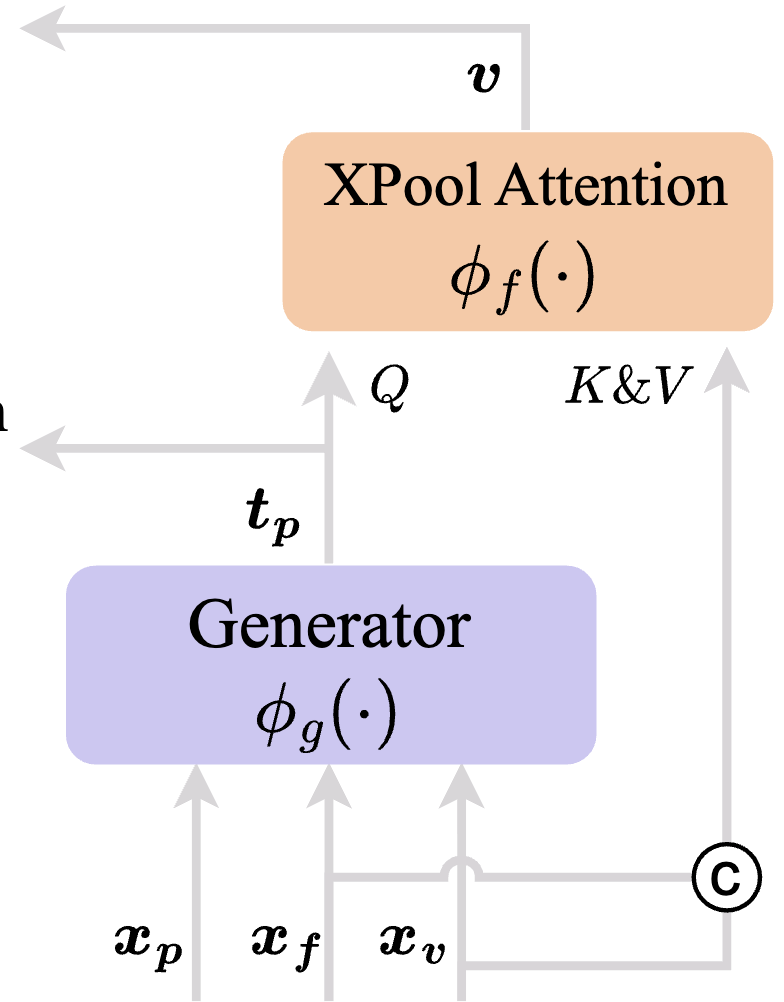 이후 생성된 tp를 활용하여 비디오 피처를 강화하기 위해 Pseudo-Interaction Fusioner를 수행합니다. 이 모듈은 XPool Attention으로 구성되며, tp를 쿼리로, xv와 xf를 키와 밸류로 사용하여 텍스트 쿼리 기반으로 향상된 비디오 표현을 추출합니다