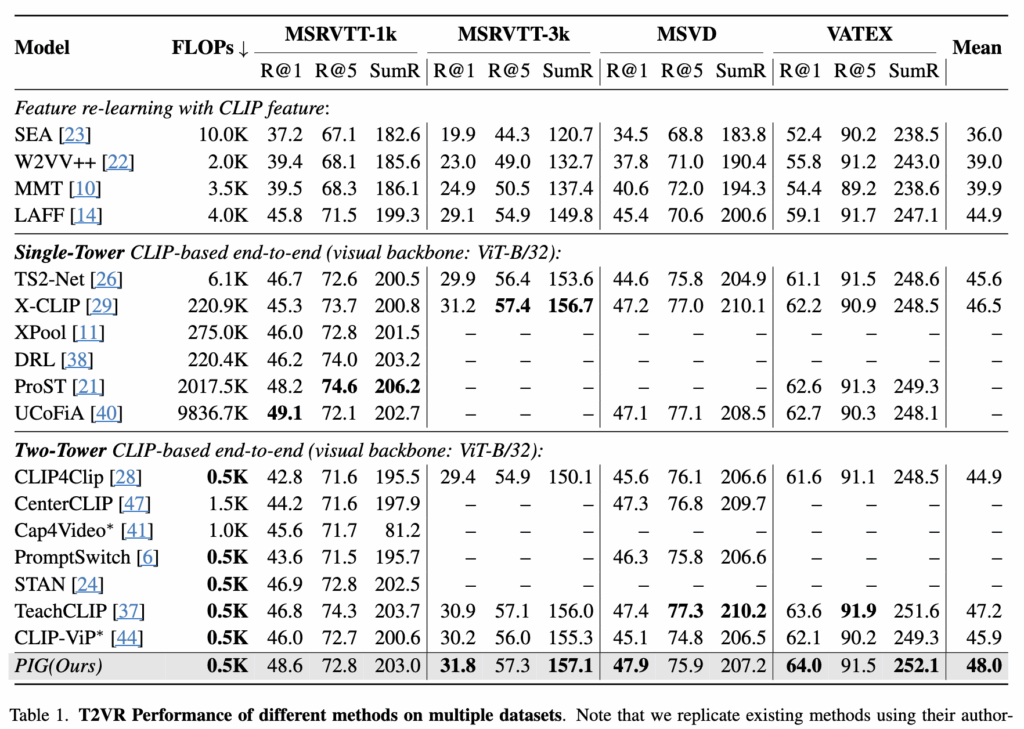 - MSRVTT-1k , MSRVTT-3k MSVD , VATEX, DiDeMo 등 다섯 가지 벤치마크에서 실험을 수행. 그 결과로 제안된 방법이 Single-Tower 모델과 비슷한 SOTA에 가까운 성능과 Two-Tower 모델의 SOTA 효율성을 동시에 달성함