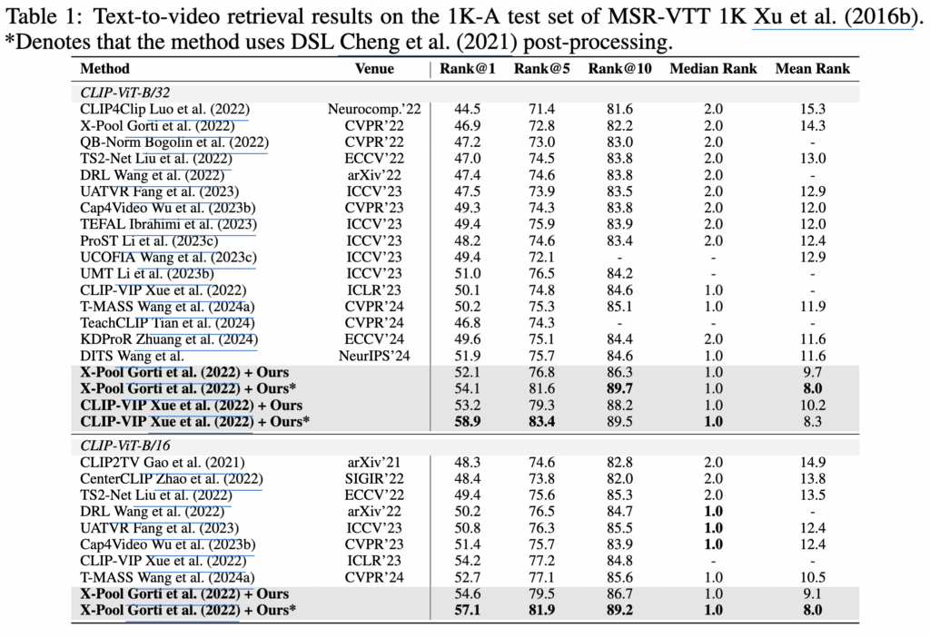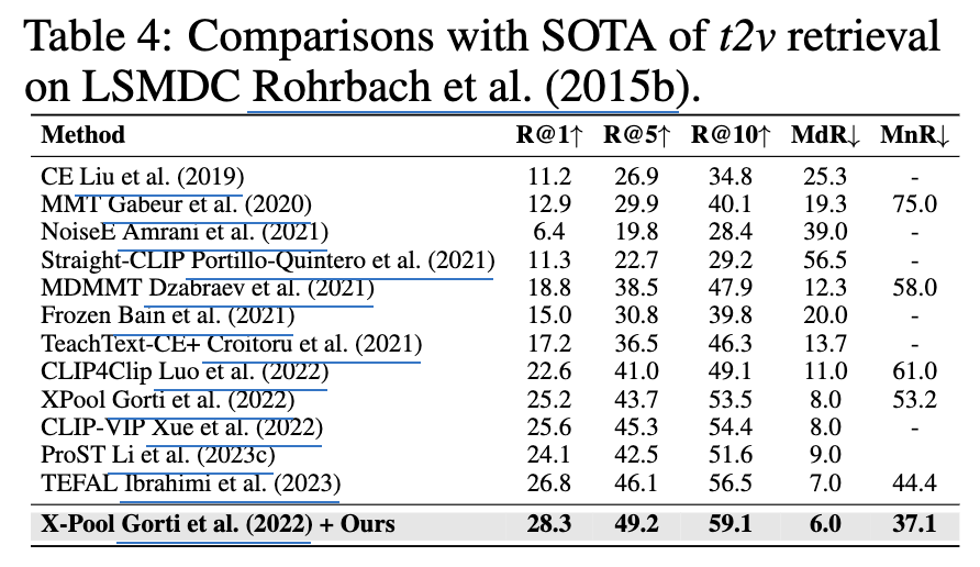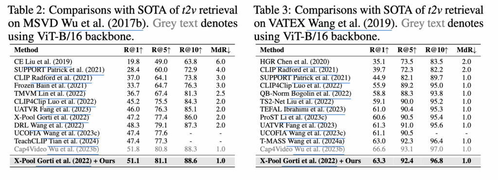 저자는 MSR-VTT, MSVD, LSMDC, VATEX 데이터셋으로 모델을 평가했습니다. 저자의 방법론은 ViT-B/32, ViT-B/16 백본 SOTA를 달성하는 것을 확인할 수 있습니다.