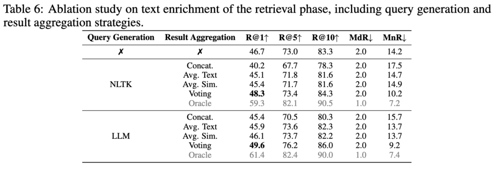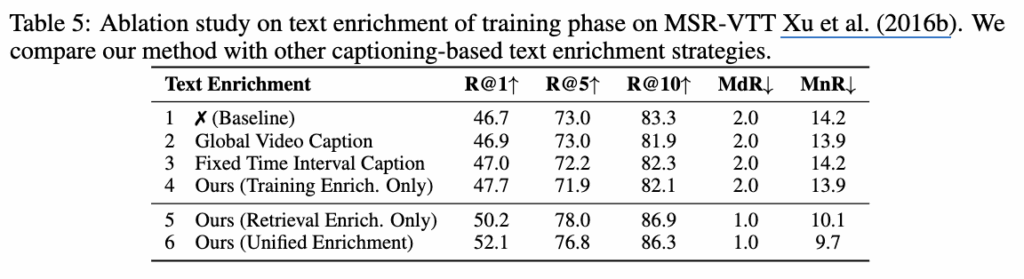 5행의 경우 학습 단계에서의 텍스트 보강은 없이, 검색 단계에서만 텍스트 보강을 적용했을 때의 성능이고 6행은 저자가 최종 제안하는 방식의 성능입니다. 이를 통해 비디오를 이벤트 단위로 분할하여 캡션하는 것이 효과적이며 검색 시 LLM을 활용하여 쿼리를 다양화하고 관련성 있는 쿼리를 선택하는 것이 효과적이라는 것을 알 수 있습니다