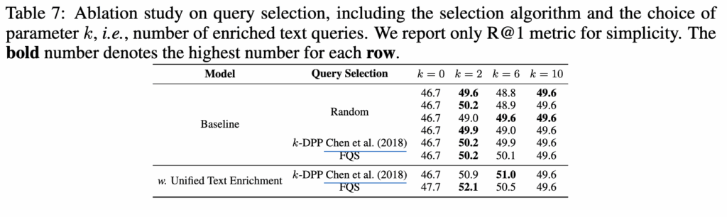 마지막으로 테이블 7에서는 생성된 쿼리 중 selection한 개수에 따른 성능을 분석한 결과입니다. 대부분의 경우 k=2에서 가장 좋은 성능을 보였으며 FQS 알고리즘을 사용했을떄 가장 좋은 성능을 보입니다. 이는 FQS가 초기 원본 쿼리를 시작점으로 해서 관련된 쿼리를 고르기 때문에 관련성을 보장하고 더 안정적인 성능을 보인다고 설명하고 있습니다.