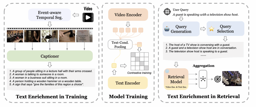 검색 단계에서는 Large Language Model(LLM)을 활용해 텍스트 쿼리를 확장,다양화함으로써 대상 비디오가 가진 의미적 복잡성을 보다 다양하게 표현할 수 있도록 합니다.