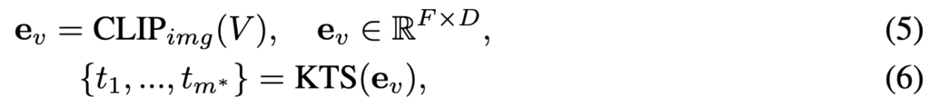 먼저 F개의 프레임을 가진 비디오 V ∈ R{F ×H×W ×3}가 주어졌을 때, CLIP을 통해 F개의 피처를 뽑습니다. 그리고 KTS 알고리즘을 통해 tm개의 변경 지점 위치를 뽑아내게 됩니다. (자세한 KTS 알고리즘은 생략하겠습니다.)