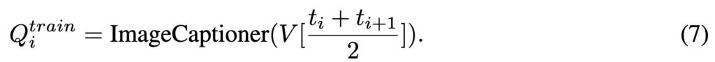 위 수식과 같이 ti와 ti+1 사이의 중간 프레임 인덱스를 사용하여 해당 세그먼트의 대표 이미지를 선택하여 이를 이미지 캡셔닝 모듈의 입력으로 사용했습니다. 이러한 방식으로 텍스트를 추가하여 확장된 데이터셋을 얻을 수 있습니다.