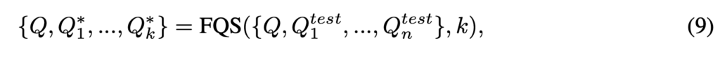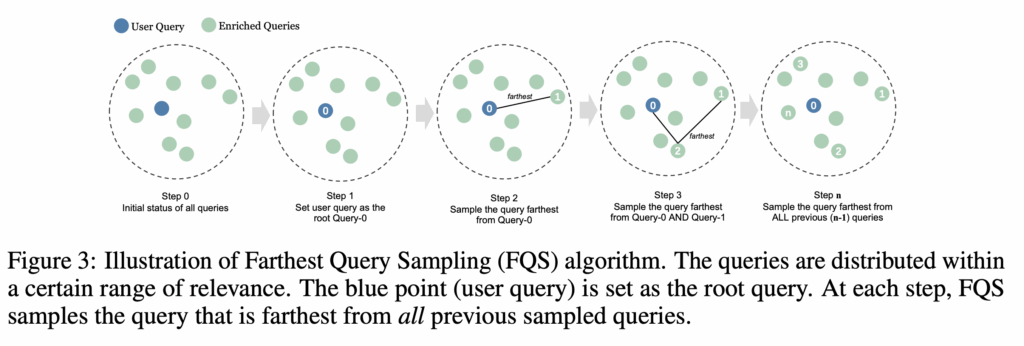 그래서 저자는 첫 번째 측면은 LLM을 통해 원본 쿼리와 관련되도록 프롬프트를 설계하였고 두 번째 측면을 고려하기 위해 쿼리 selection에서 Farthest Query Sampling (FQS) 알고리즘을 사용하여 쿼리를 선택합니다. FQS는 선택된 쿼리들 사이의 최소 거리를 최대화하는 방식으로 쿼리를 반복적으로 선택하는 알고리즘입니다.