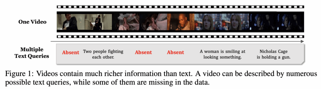 예를 들어 쿼리 A에와 관련이 없다고 간주되는 프레임은 쿼리 B와 관련이 있을 수 있습니다. 하지만 쿼리 B가 학습데이터에 없다면 이 정보는 모델 학습 과정에서 학습이 안될 가능성이 높습니다. 따라서 이러한 상황에서는 비디오의 임베딩이 쿼리 A에 치우치는 문제가 발생하고 쿼리 B가 주어졌을 때 정확한 비디오를 찾는데 어려움이 있을 수 있습니다.