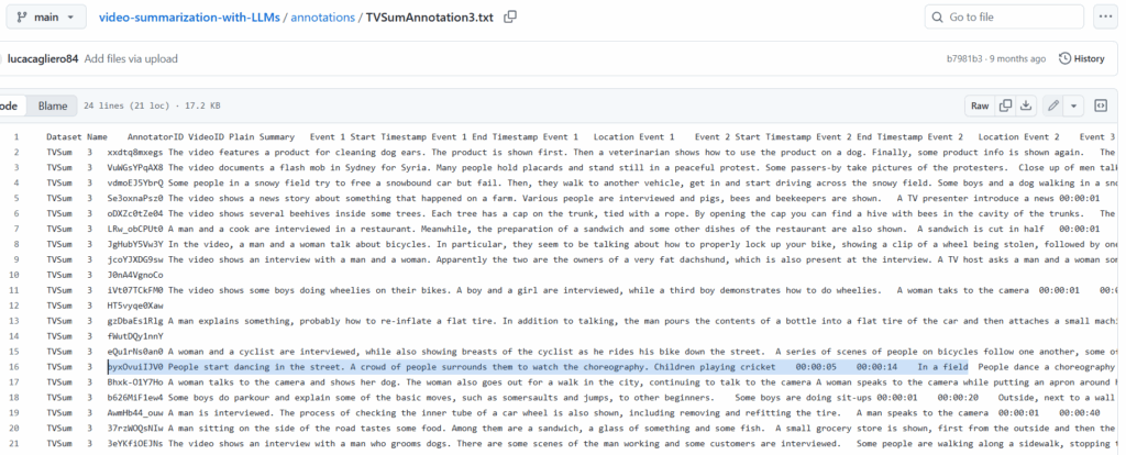 따라서 저자들은 Table1에 명시된 5가지 데이터셋을 기반으로 데이터셋 당 20개의 비디오를 무작위 선별하고 가공하여 데이터셋을 구축하였습니다. 구축한 데이터셋은 저자들의 깃허브(https://github.com/VaianiLorenzo/video-summarization-with-LLMs)에서 확인할 수 있다고 합니다.