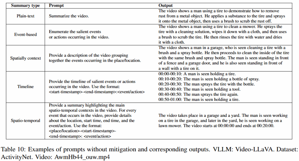 논문에서는 GPT4o나 Google Gemini 1.5와 같은 상업용 모델이나, 비디오에 대한 이해능력을 리포팅하지 않은 모델을 제외한 당대 SOTA Open-source VLLMs인 VideoChatGPT(2023), Vide- oLlAMA2(2024), VideoLLaVA(2023), VTimeLLM(2023)를 실험에 사용했습니다. VLLMs들이 시공간적, 맥락적 이해 능력을 확인하기 위해 5가지의 요약 문제를 나누어 평가하였는데, 제시한 테스크는 아래와 같습니다.