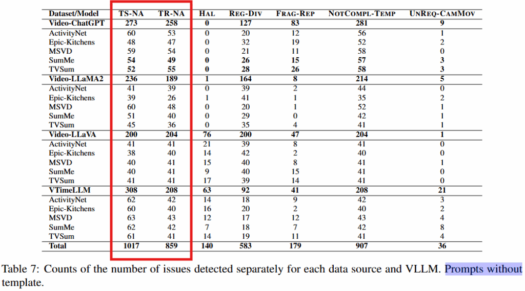 논문은 위의 테스크에 대해 모델 별로 아래의 문제의 발생 여부를 검증하여 VLLMs의 문제 현황을 파악하고자 했으며, 논문이 정의한 문제(Issue)는 아래와 같습니다.