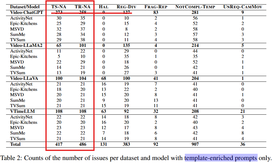 실험은 템플릿을 명시적으로 지정한 template-enriched와 템플릿을 지정하지 않은 without template을 나누어 리포팅 되었습니다. without template의 경우 타임스템프 혹은 타임 범위(Time-Range)를 누락하는 경우가 허다하여, 본문에서는 template-enriched 결과를 메인으로 리포팅했습니다. 아래에서 확인할 수 있듯이 논문이 정의한 Issue들이 다수 발견되어 해결이 시급함을 확인할 수 있습니다.