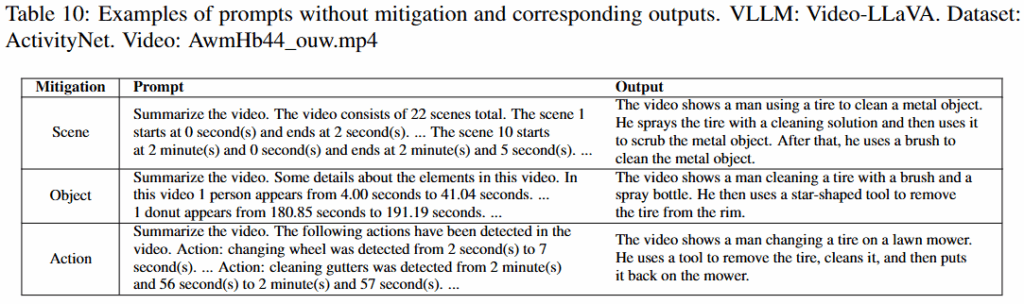 실험 결과는 Table3와 같으며 No mitigation은 제시한 완화전략을 사용하지 않은 베이스라인입니다. 최종적으로 Action에 관한 정보를 추가적으로 제공할때, 성능 개선에 가장 효과적이였음을 확인할 수 있습니다. 그러나 spatio-temporal 테스크와 같이 복잡도가 높은 경우에는 정확한 추론이 여전히 어려움을 확인할 수 있습니다. 한편 장면 분할과 객체 정보 역시 베이스라인 대비 성능 개선을 보였으나, Action 정보 대비해서는 미미한 개선을 보였다고 합니다.