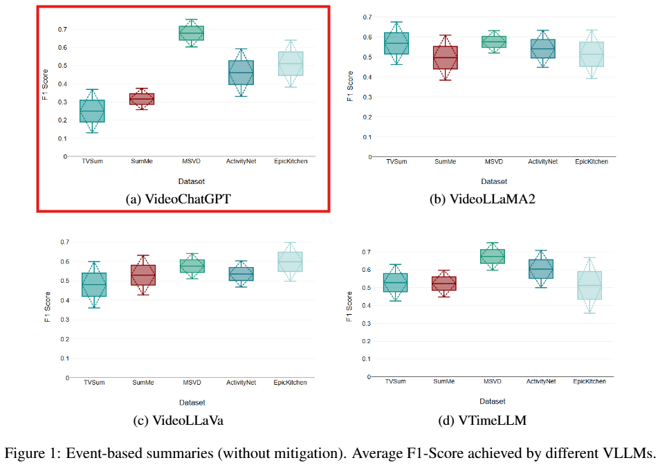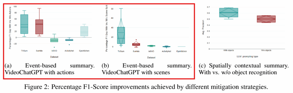아래는 실험에 사용된 모델 별로 요약에 대한 F1 score 결과 입니다. 모든 데이터셋에 대해 완화전략을 사용하지 않은 베이스라인 성능은 Figure1과 같으며 VideoChatGPT가 가장 덜 안정적인 성능을 보임을 확인할 수 있습니다. 따라서 VideoChatGPT를 기준으로 액션과 장면분할 정보를 주입하는 완화전략을 취했을때, 이러한 데이터셋 별 성능 분산이 낮아지며 안정적인 성능을 보일 수 있음을 Figure2 (a, b)에서 확인할 수 있습니다. 또한 객체정보를 주입한 Figure2 (c)를 통해 확인할 수 있다고 합니다.