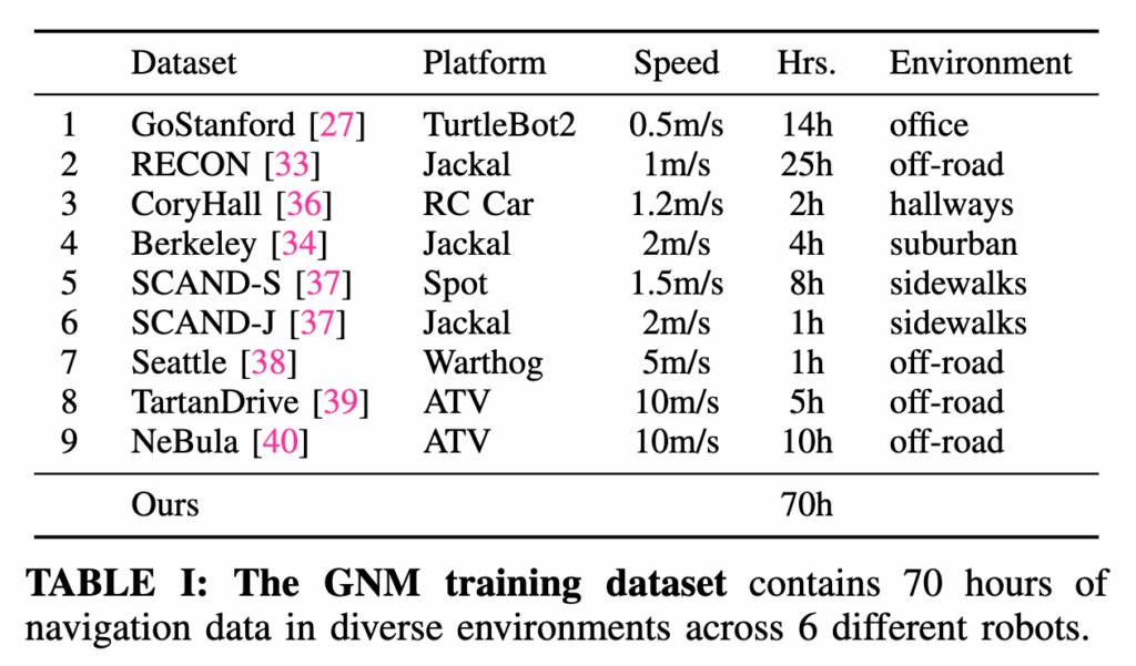 그리고 저자는 이런 GNM 데이터셋이 확장성이 좋다고합니다. 원한다면 새로운 내비게이션 데이터셋을 추가로 섞을 수도 있고 혹은 특정 응용 목적에 맞게 일부 subset만 골라서 사용할 수도 있습니다.