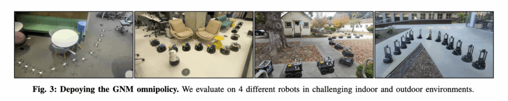 이번 섹션은 학습된 GNM을 실제 다양한 로봇 위에 얹어서 실험했을 때 이 모델이 정말로 로봇에 구애받지 않고 일반화할 수 있는가를 검증하는 실험 부분입니다.
