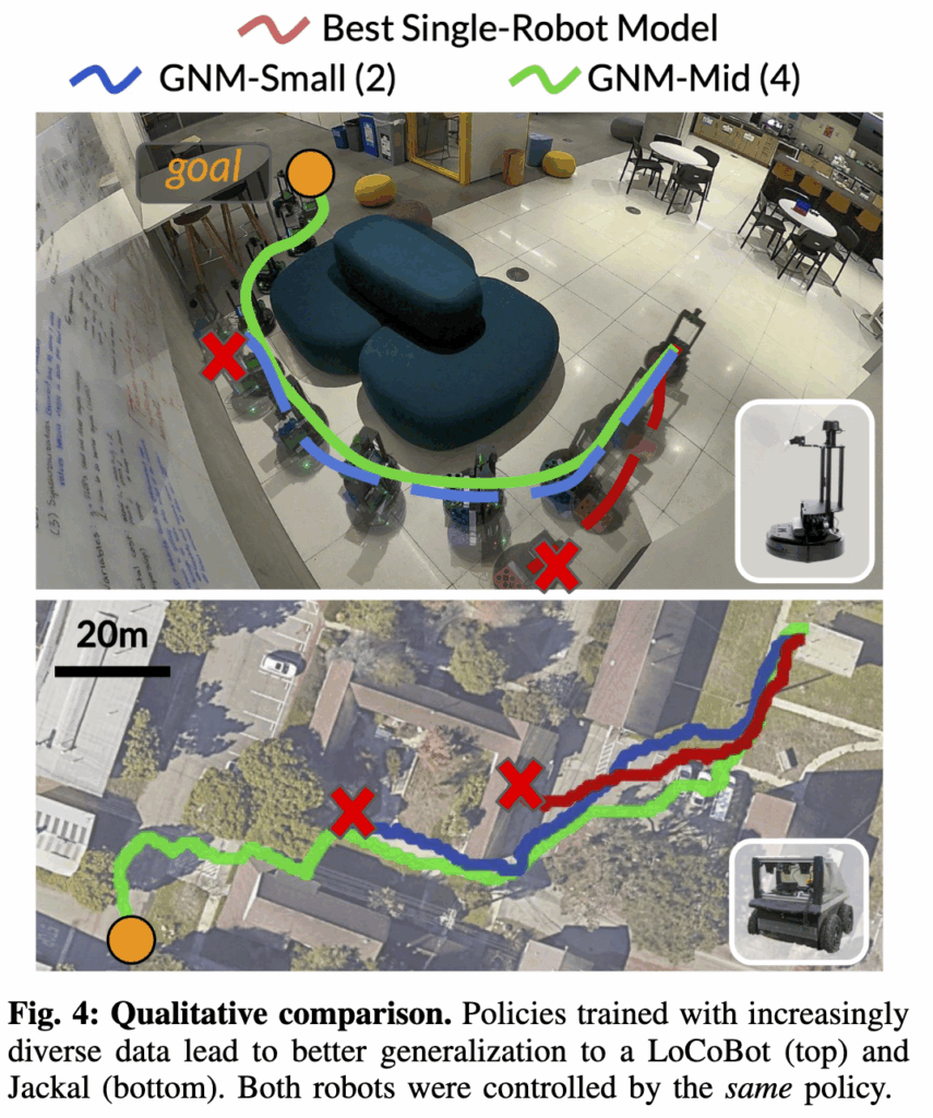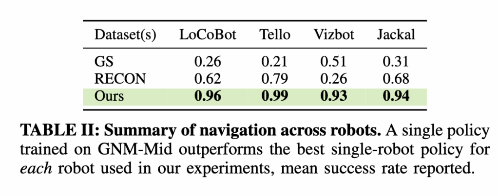 저자들은 하나의 동일한 GNM 모델을 추가 학습(finetuning) 없이 Vizbot, LoCoBot, Clearpath Jackal, DJI Tello(드론) 등총 4종의 완전히 다른 로봇 플랫폼 위에서 바로 실험했습니다. 결과적으로 표를 보시면 GNM이 드론(Tello) 같은 전혀 다른 구동 구조를 가진 로봇에서도 비행 데이터를 학습하지 않았음에도 불구하고 내비게이션을 수행했음 보입니다. 그리고 모든 로봇에서 싱글 로봇 정책보다 더 높은 성공률을 보입니다.
