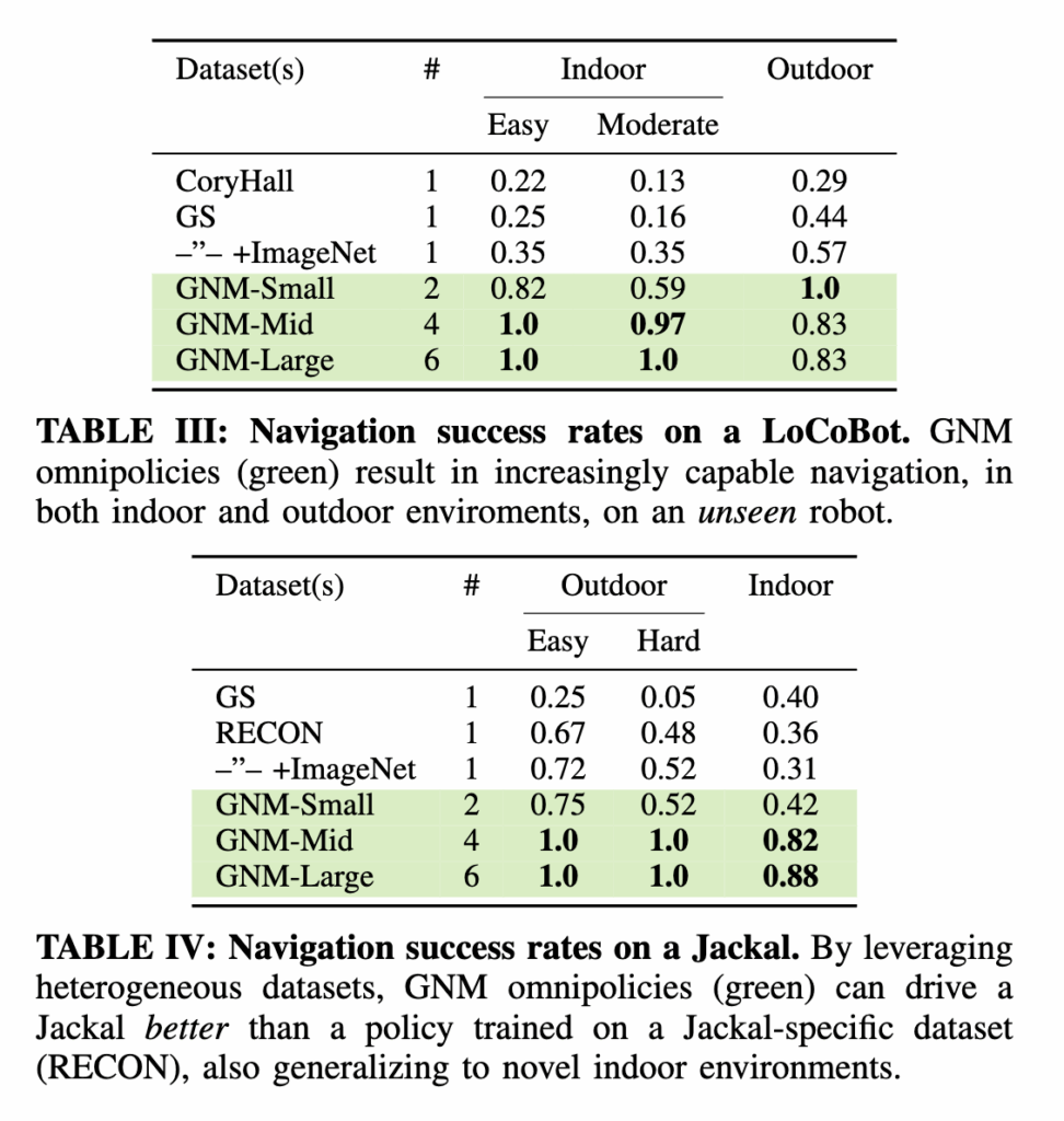Jackal과 LoCoBot에서 수행된 평가 결과를 보면 데이터셋의 개수가 많아질수록 (GNM-Small -> Mid -> Large)성능이 꾸준히 향상되는 것을 확인할 수 있습니다. 그리고 추가된 데이터가 직접적으로 관련 없는 환경에서 왔는데도 전체 내비게이션 성능이 좋아지는 것도 보실 수 있습니다. 결국 모델이 로봇 간 공통적인affordance를 학습했다라고 보여주는 표인 것 같습니다.