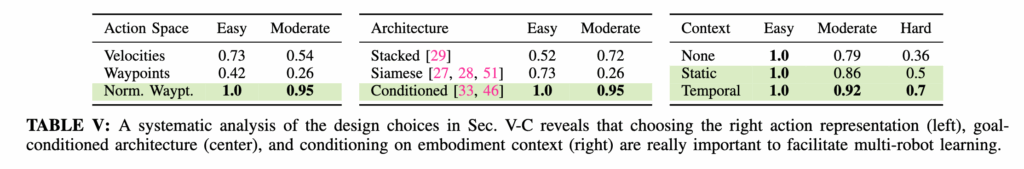 저자들은 LoCoBot을 대상으로 체계적으로 비교했습니다. Shared Action Space같은 경우 속도 명령 기반, 절대 waypoint, 정규화된(normalized) waypoint 세 가지를 비교했을 때 정규화된 waypoint가 가장 성능이 좋은 것을 확인할 수 있습니다. 근데 Action space같은 경우에는 Hard 환경을 리포팅 하지는 않았지만 저자는 특히 Hard 환경(좁은 통로, 급회전 구간 등)에서 두드러졌다고 합니다. 행동 표현을 정규화하는 것이 로봇간 서로 이질성을 통일하여 학습하는데 유리하다라는 것을 보여주는 표인 것 같습니다. 그리 Embodiment Context같은 경우에 로봇의 Context 정보를 담는 방식 중에서는 시간적으로 연속된 관찰(temporal context)을 활용한 경우가 가장 성능이 높았음을 확인하실 수 있습니다. 이류가 저자는 여기에 연속된 시각 정보 속에는 로봇의 속도나 회전 반경 같은 동역학적 특성이 암묵적으로 담겨 있기 때문이라고 합니다. 그리고 Policy Architecture같은 경우에는 논문 본문에서는 해당 구조에 대해서 언급이 없어서 해당 표를 이해하기 어려웠는데 최대한 이해한대로 설명을 드리면 단일 인코더(현재 관찰 이미지와 목표 이미지를 채널 방향으로 단순히 쌓는(stacking) 방식-> 하나의 인코더에서 동시에 처리), Siamese(두개의 독립적인 인코더로 현재 이미지와 목표이미지를 각각 처리한다음에 두 임베딩을 결합하는 구조), Conditional 구조(Fig2)를 비교한 결과 Conditional architecture가 가장 좋은 것을 확인할 수 있습니다. 관찰 정보가 정책 출력에 직접 영향을 미치는 구조가 더 일반화 가능한 표현을 학습하게 한다는 걸 보여준다는 것을 보여주는 것 같습니다.