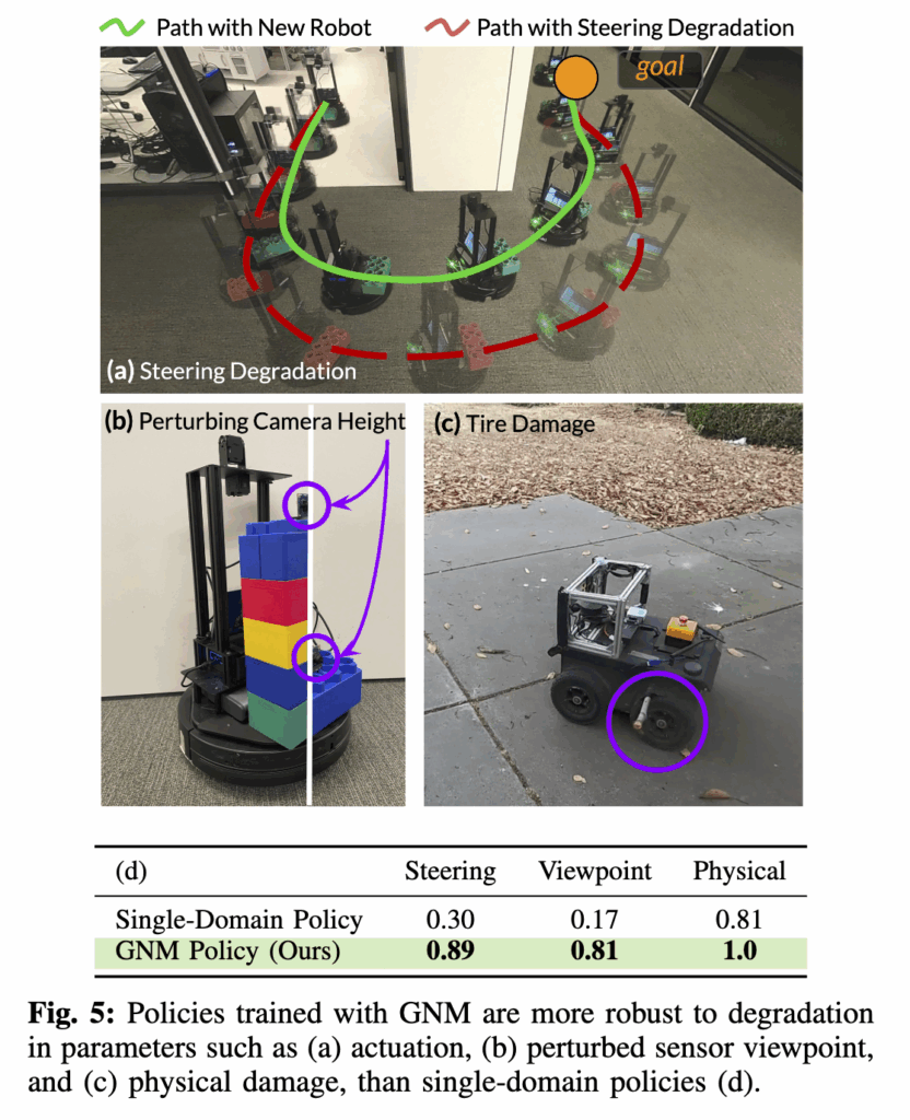 마지막으로 저자들은 GNM이 학습 데이터에서 보지 못한 센서나 기구적 변동에도 성능저하에 강인한지를 실험했는데 조향각 제약(steering degradation)을 인위적으로 가한 경우 GNM은 단순히 회전을 포기하지 않고 더 길고 부드러운 경로로 대체하여 이동했습니다(a). 이는 제약을 인식하고 합리적으로 대응한 것으로 보입니다. 또 카메라 높이나 위치를 바꾸거나(b) 로봇을 일부 손상(c)시킨 경우에도 GNM은 안정적으로 목표 지점에 도달했습니다.타이어 손상에도 결국 다양한 로봇 데이터로 학습된 정책이 센서 노이즈나 하드웨어 불확실성에도 일반화된 행동 패턴을 학습했다고 볼 수 있습니다.