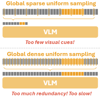 최신 Video understanding 연구는 이러한 Samling Dillemma에 대해 보통 Uniform sampling 전략을 적절하게 활용하는것으로 대응합니다. 그러나 Uniform sampling을 아무리 적절히 조절하더라도 Trade off를 해결할수는 없습니다.