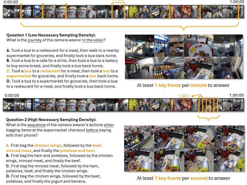 예제를 통해 살펴봅시다. 위의 그림1은 Video understanding의 대표적인 테스크인 VQA의 시행 예시인데요, 질문에 따라 집중해야하는 영역(영상의 노란색 바)이 다르며, 그 밀도도 다릅니다. 어떤 질문은 영상에서 전역적인 정보가 중요하고, 다른 질문은 영상에서 해당하는 지엽적인 정보가 밀도있게 중요하며, 테스크를 수행하기 위한 필수(Necessary) 샘플링 밀도(Sampling Density)가 상이하다는 것입니다.