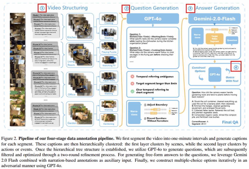 논문은 Long video에 대해 다양한 NSD를 필요로하는 질의응답셋을 구축하기 위해 4단계 파이프라인을 제시하였습니다: Video Hierarchical Structing, Questioin Generation, Answer Generation, Multiple-choice Question Construction