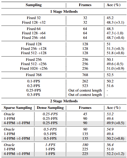 표1의 벤치마크 실험 결과는 Sampling Dilemma가 실제로 존재하며 중요한 문제임을 시사할 수 있는 결과입니다. 실험은 표에서 확인할 수 있듯이 Gemini-2.0-Flash, Qwen-2.5VL, Qwen-2VL, LongVA, LongVila, InternVideo2.5에 대해 진행되었으며 Uniform sampling으로 1FPS를 기준으로 하였으나, 제안된 데이터셋이 long video이기 때문에 해당 입력을 수용하지 못하는 모델의 경우 모델에 고정된 입력에 맞추어 샘플링(Fixed)하여 실험을 진행했다고 합니다.