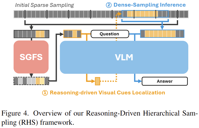 Sampling Dillemma를 해결하기 위해 논문은 2 stage 기반의 training-free 샘플링 전략인 Reasoning-Driven Hierarchical Sampling (RHS)와 plug and play로 동작할 수 있는 보조 전략인 Semantic-Guided Frame Selector를 제안합니다.
