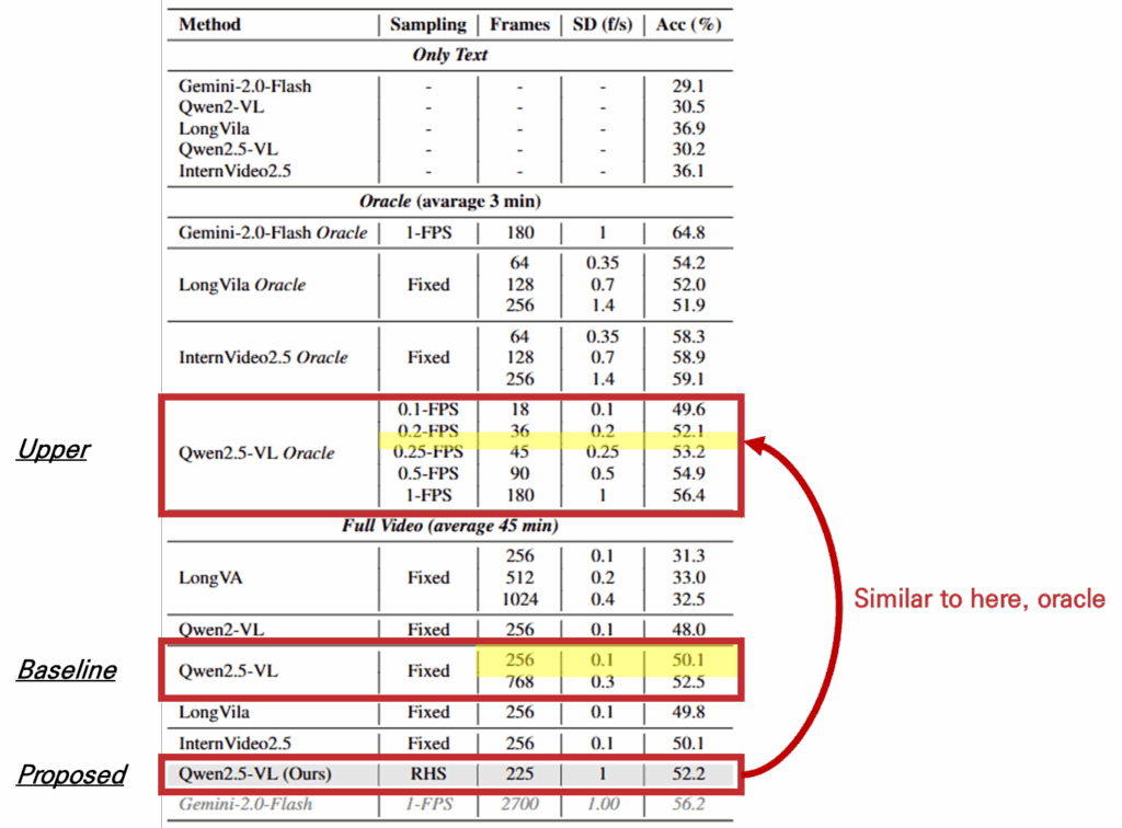 실험의 상한을 제공하기 위한 Oracle 실험과 전체 비디오를 활용하는 Full video에서 알 수 있듯이 쿼리 등에 적합한 영역에서 샘플링을 진행하는것이 Uniform sampling 보다 유용하며 NSD를 고려한 샘플링이 필수적임을 확인할 수 있습니다. 또한 Qwen2.5-VL 모델에 대해 기존 샘플링 기법을 사용하여 256개의 프레임을 선정한것에 비해 제안하는 RHS 전략으로 225개의 프레임을 선정하는것이 유의미했으며, 이는 Upper에서 0.2 FPS로 샘플링한것보다 높은 성능으로 영상의 주요 위치를 Uniform sampling 대비 잘 특정하고 있음을 알 수 있습니다.