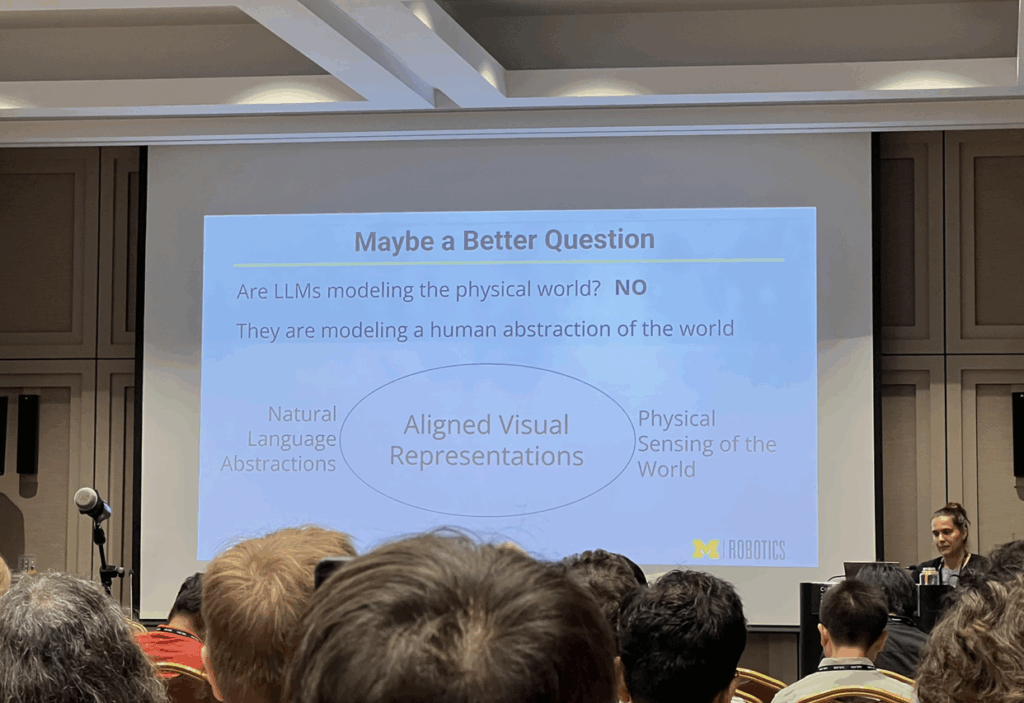 미시간대 Bernadette Bucher 교수님은 World Models의 조건에 대해 논의를 하였습니다. 먼저, World model은 세상에 대한 이해(abstrction)와 미래에 대한 예측(causality)이 필수이며, world에 대한 인식을 위해 물리적 센싱이 필요함을 어필하였습니다. 그리고 사람의 언어적 추론(추상화)와 물리적 상태를 computer vision 모델로 연결할 수 있다고 보았습니다. 더 나아가 로보틱스 관점에서 좋은 world model이 갖춰야 할 조건으로 actionable을 정의하였습니다. actionable은 inference speed와 컴퓨팅 자원, task에 대한 성공으로 구성되며 학습과는 별개입니다. 이처럼 저자들은 World Model의 핵심 조건을 causal, abstract, actionable 3가지로 정리하였습니다. 이를 기반으로 기존의 LLM은 물리적 이해를 바탕으로 한 미래 예측이 어렵기 때문에, 이 중 causality 조건을 충분히 만족하지 못한다고 보았습니다. 마지막으로, 센싱한 물리적 정보와 언어로된 사람의 추상화된 추론 사이를 연결하기 위해 visual representation의 활용 가능성을 어필하였습니다.