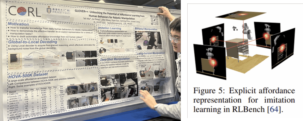 제가 관심있는 분야이다보니, affordance 키워드가 있으면 최대한 설명을 듣거나 이야기를 해보려 했었습니다. 제가 리뷰했었던 O3Afford포스터도 있어서 가서 설명을 듣고 궁금한걸 좀 물어보긴 했습니다. 그러나.. 아쉽게도.. 다시한번 영어 speaking의 문제로… 발표한 포스터에 대한 질문만 하고 마무리하게 되었습니다… 그리고 affordance 예측 결과를 visual representation을 활용하여 이후의 action을 예측하도록 하는 연구들도 점차 증가하고 있습니다. 아래의 첨부한 포스터는 그 중 하나로, 오른쪽 그림처럼 affordance 영역을 이미지 위에 표시한 뒤 imitation learning을 수행했을 때, 잘 작동하더라 하는 연구였습니다.