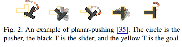 평면 푸싱(planar pushing)은 로봇 팔 끝의 pusher로 평면 위에 있는 T자형의 물체를 밀어서 목표 위치까지 옮기는 조작 과제입니다. 원형 푸셔를 이용해 검은 T자 물체를 노란색 T자 모양 표적까지 밀어 움직입니다. Planar-Pushing From Pixels이라는 것은 로봇이 환경의 완전한 물리 상태를 알지 못하고 카메라 이미지 관측만으로 조작을 수행한다는 뜻입니다. Push T 태스크가 고차원 visuomotor policy의 핵심을 포함하고 있으면서도, 시뮬레이션을 통한 데이터 생성이 비교적 용이하여 실험용 표준 과제로 널리 쓰이고 있다고 합니다. 해당 연구에서도 planar pushing을 테스트베드로 삼아 다양한 시나리오를 실험했습니다.