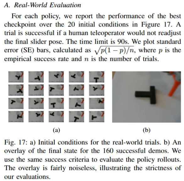 저자들은 Diffusion Policy 알고리즘을 사용하여, 픽셀 관측에 기반한 평면 푸싱 과제에서 시뮬레이션-현실 공동학습을 수행하였습니다. 총 50개 이상의 real기반 policy (1000회 이상의 실험)과 250개의 시뮬레이션 기반 policy(5만 회 이상의 시뮬레이션 실험)을 통해 매우 방대한… 실험 및 분석을 진행하였습니다. 결과를 요약하자면 다음과 같다고 합니다.