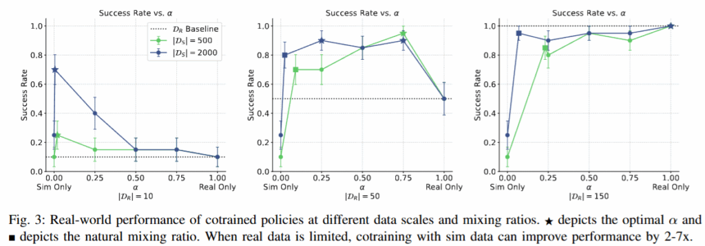 A1. 저자가 real data 수를 바꿔가며 실험을 진행할 때, Real data가 150개일땐 Real data 만으로도 성공률 100퍼센트를 달성했습니다. 따라서 150개라고 생각하시면 될 것 같습니다. 150개 까지는 100퍼센트는 아니지만 사용된 real데이터가 늘어날수록 점진적으로 Co-training한 정책의 성공률도 같이 올라갔습니다.