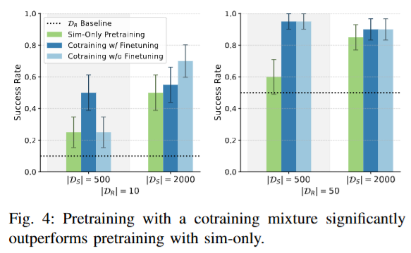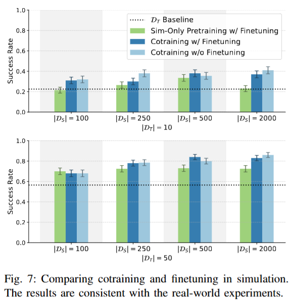 Co-training이 finetuning의 접근보다 나은지 평가하기 위해, 두 가지 전략을 시험했다고 합니다. 시뮬레이션 데이터로만 학습한 뒤 현실 데이터로 파인튜닝한 경우와 시뮬레이션 + 현실데이터로 co-training 한 뒤 현실데이터로 파인튜닝을 진행한 경우 두가지로 나누어서 실험을 진행했습니다. 실험 결과, 데이터를 처음부터 혼합하여 학습한 경우가 두 단계를 나눠 학습한 경우보다 일관되게 높은 성능을 보였다고 합니다. 또 단일 task인 설정에서는 co-training 후 추가 파인튜닝을 해도 성능이 크게 향상되지 않았는데, 저자들은 co-training 정책이 이미 현실 환경에 대한 일반화가 되어 있으므로 추가 파인튜닝이 오히려 개별 사례에 대한 오버피팅을 일으킬 수 있다고 해석했습니다. 저자들은 멀티태스크의 경우에는 파인튜닝 효과가 달라질 수 있을 것 같다고 언급했습니다. 추가로 실험은 안 한것 같습니다.