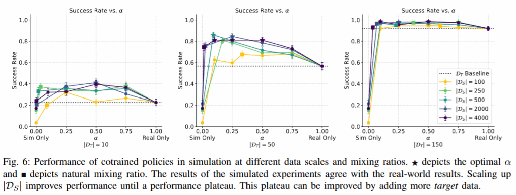- 시뮬레이션 데이터를 함께 사용해 Co-training을 진행한 policy는 현실 데이터만으로 학습한 경우 대비 2~7배 높은 성공률을 보였으며, 현실 시연 데이터가 매우 적은 경우에도 큰 성능 향상을 달성했다고 합니다. 다만 시뮬레이션 데이터의 양을 계속 늘려도 이러한 성능 이득은 점차 줄어들어 추가 현실 데이터 없이는 일정 수준에서 정체 현상이 나타났다고 합니다. 기존 NVIDIA에서 처음으로 제시된 연구와 같은 현상 (co-training policy의 성능 고점은 real data의 수가 정해준다) 입니다.