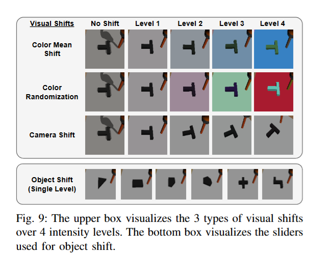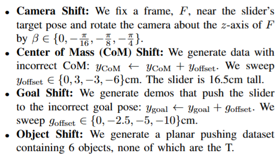 솔직히 지금까지는 기존 논문과 딱히 다른점이 없었는데, 여기서부터 좀 재밌는 실험들이 있었습니다. 저자들은 현실과 시뮬레이터 사이에 존재할 수 있는 다양한 domain shift들이 co-training 성능에 미치는 영향을 조사했습니다. 아래와 같은 shift가 고려되었습니다. 카메라의 시야, 무게중심, goal pose, object 종류가 고려되었습니다.