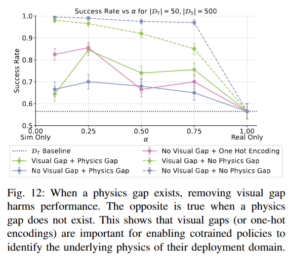 이러한 도메인 식별의 필요성은, 두 환경의 물리 특성이 서로 다를 때 더욱 두드러지게 나타난다고 합니다. 아래 figure 12를 보면 시뮬레이터와 현실 간 physics gap이 존재하는 경우, 두 환경의 visual gap을 제거해버리면 정책의 현실에서의 성공률이 크게 떨어졌습니다. 반면 환경을 나타내는 one hot encoding 정보를 정책에 추가로 제공했을 때 다시 성능이 좋아졌는데, 이를 통해서 정책이 시각적 단서 또는 명시적 신호로 환경을 구별할 수 있어야 함을 또 증명할 수 있었다고 합니다. 또 physics gap이 없는 경우에는 정반대의 결과가 나타났습니다. 두 환경이 물리적으로 동일하다면 시뮬레이터와 현실 간의 visual gap을 제거하는 것이 오히려 성능을 높였습니다. 어느정도 당연하겠지만 환경 구분이 필요하지 않을정도로 구성된 상황에서는 불필요한 시각 차이를 줄이는 편이 유리하다는 의미입니다. 결국 co-training 정책이 환경을 식별하는 능력이 중요한 이유는, 시뮬레이터와 현실의 물리엔진이 다르기 때문이라는 결론을 낼 수 있을 것 같습니다. 이런거 보면 정말 neural physics engine이 발전하거나 world model을 활용하는 방법으로 흘러가는게 맞는 것 같습니다..
