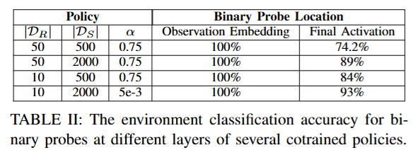 저자들은 Co-training이 효과가 있으려면 정책이 현재 입력이 어느 도메인(시뮬레이션인지 현실인지)에서 온 것인지 식별할 수 있어야 함이 밝혀졌다고 합니다. 성능이 높은 co-training 정책일수록 동일한 관측에 대해 시뮬레이터와 현실에서 서로 다른 행동을 예측하도록 학습되며, 정책이 환경을 구분하고 다른 전략을 구사한다는 것을 밝혔다고 합니다.저자들은 아래 Table 2와 같이 학습된 정책 네트워크의 내부 표현을 분석하여, 이진 분류기를 통해 해당 임베딩이 시뮬레이션에서 나온 것인지 현실에서 나온 것인지 아래 표와 같이100% 정확도로 맞출 수 있음을 보였습니다. 초기 시각 특성을 추출한 네트워크 층의 임베딩에서는 환경 분류 정확도가 100%에 달했고, 최종 출력 직전의 임베딩에서도 74~93% 수준의 높은 정확도로 환경 정보를 보존하고 있었습니다. 저자들은 이는 정책 신경망이 관측에 내포된 환경 구별 단서를 학습 과정에서 잃지 않고 끝까지 전달하고 있다는 뜻으로 해석했습니다. 그러면서 성공적인 co-training 정책은 시뮬레이터와 현실을 구분하며, 각 환경에 맞는 동작을 따로 익히는 것으로 나타났다고 합니다.