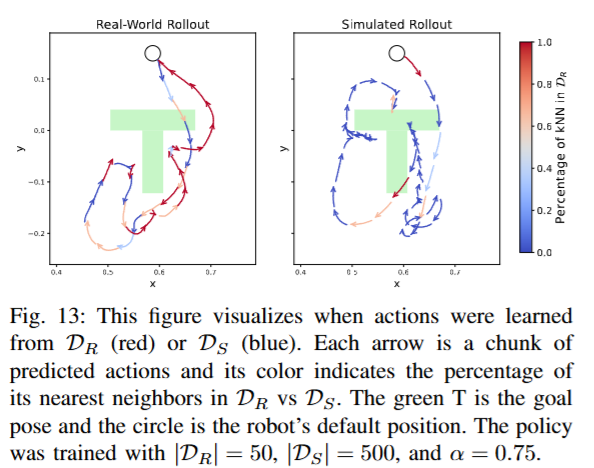먼저 데이터 커버리지 관점에서 시뮬레이션 데이터 현실 데이터가 포괄하지 못한 state-action gap을 메워주는 역할을 한다고 합니다. 저자들은 하나의 co-training 정책을 동일한 초기 상태에서 현실 환경과 시뮬레이터에서 각각 실행시키고, 각 행동 결정에 가까운 K-nearest neigbor가 현실 시연에 속하는지 시뮬레이션 시연에 속하는지 색깔로 표시하여 시각화했습니다. (녹색 T가 target, 원은 로봇의 초기 푸셔 위치입니다). 아래 Figure 13에서 볼 수 있듯이, 현실 환경에서의 정책의 rollout은 경로 대부분(빨간색 화살표 구간)은 현실 데이터상의 경험들을 참고해 행동을 결정했으나 중간중간 현실 데이터에 없는 구간에서는 시뮬레이션 데이터에 의존하는 모습이 관찰되었습니다. 반대로 시뮬레이터에서의 rollout은 주로 파란색(시뮬레이터)에 의존하면서도 일부 구간은 빨간색(현실 이웃)이 섞여 있었습니다. 흥미로운 점은, 이 실험에서 시뮬레이션 데이터 D_S의 규모가 현실 D_R의 10배였음에도 불구하고 현실 환경에서의 정책 결정은 여전히 현실 데이터 위주(대부분 빨간색)로 이루어졌다는 것입니다. 일관되게 시뮬레이션 데이터로 현실 데이터를 완전히 대체할 수 없고 섞어서 활용해야 시너지가 생긴다는 점을 알 수 있습니다.