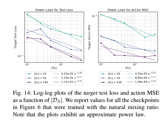 추가적으로 시뮬레이션 데이터가 늘어남에 따라 현실 도메인에서의 test loss와 actionMSE가 얼마나 감소하는지를 분석한 결과, power law에 따라 오류가 줄어드는 양상 (로그-로그 스케일에서 직선 형태의 감소 추세라고 합니다) 이 나타났습니다. Test loss는 Diffusion Policy의 학습 과정에서 사용하는 denoiser loss를 테스트 데이터셋에 대해 계산한 값입니다. 학습된 denoiser가 unseen에서 얼마나 noise를 action으로 잘 변환했는지에 대한 지표로 생각하면 될 것 같습니다. Action MSE는 gt action과의 MSE입니다.
